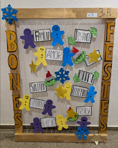Cada grup classe inicia una reflexió col·lectiva a partir de les experiències personals sobre el Nadal. Després de posar-les en comú, decideix quina mirada crítica vol representar i dissenya un muntatge artístic amb un marc de fusta i materials diversos. A nivell de centre, totes les obres s’exposen conjuntament en un espai compartit, convidant a observar i dialogar sobre la diversitat de vivències i emocions associades a aquestes festes.