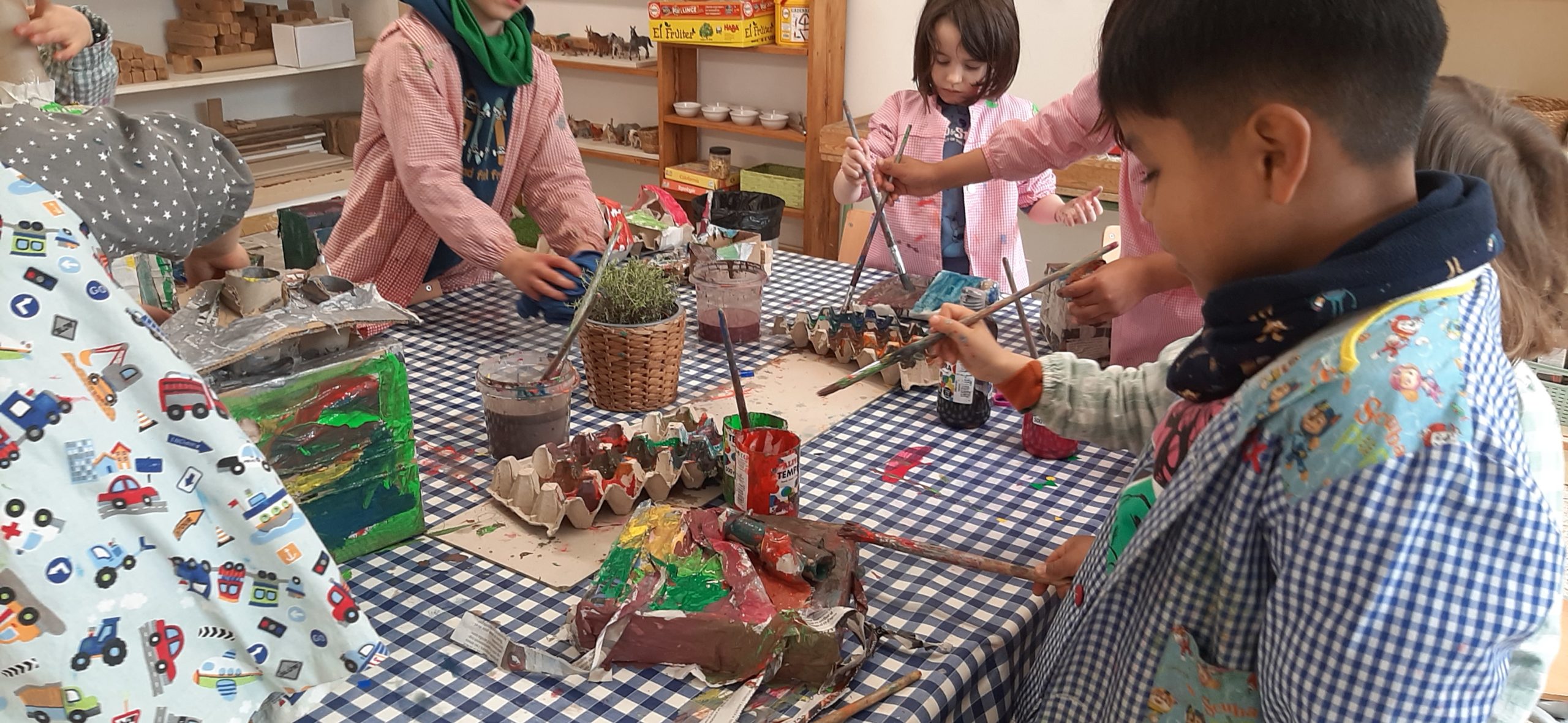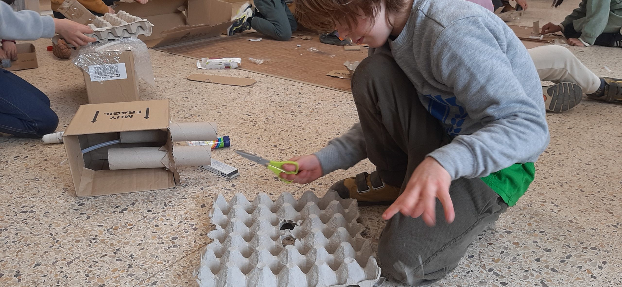 Comencem el projecte fent un seguit de converses i reflexions vers les joguines, el consumisme, la possibilitat de crear nosaltres mateixos allò que ens agrada i fomentar la creativitat. Entre tots, arrepleguem material de rebuig i treballem les formes geomètriques i el volum, així com les possibilitats, les qualitats i atributs de cada forma. Posem a prova els equilibris, la força, la pressió... i amb una fantàstica aliada (cinta de pintor i cinta adhesiva) ens atrevim a confegir originals creacions amb finalitats ben diverses.